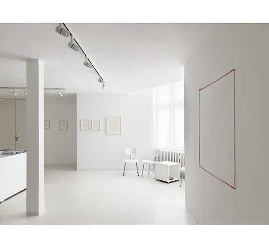 In the Marginalis group of works, the edge of the sheet becomes the defining theme. Hinsberg traces the edge of the sheet by hand with red ink and then cuts it out. The outside of the exposed line is the straight, machine-made edge of the paper, while the inside is moving, following the application of colour by hand. Presented freely on the wall, the red rectangles are fascinating.
