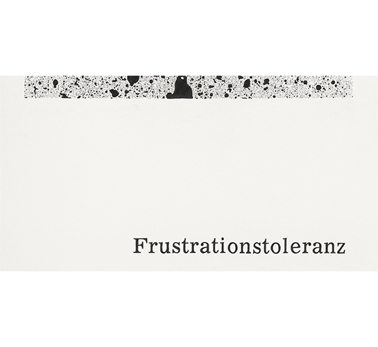 As a reaction to the Corona-conditioned retreat to the narrowest private world, Mosettig decides in the spring of 2020, unlike in all previous groups of works, to produce his drawing models for the group of works "Typeface Corona" himself. He smears, splatters glass slide frames in a sometimes angry manner and projects them onto paper. To accompany the pictures, some of which are very time-consuming to produce, he draws on the lower edge of the picture terms and text fragments - such as Empfindungshektik or Frustrationstoleranz - that appear in the media or in private conversations, in books or in memory in the coming months. The typeface "Corona" used for this purpose gives the group of works its name with bitter irony.