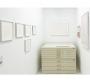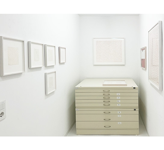 In the Marginalis group of works, the edge of the sheet becomes the defining theme. Hinsberg traces the edge of the sheet by hand with red ink and then cuts it out. The outside of the exposed line is the straight, machine-made edge of the paper, while the inside is moving, following the application of colour by hand. Presented freely on the wall, the red rectangles are fascinating.