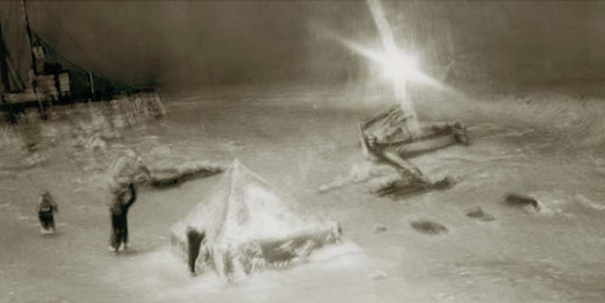 What can be seen are a view thickly bundled, lost figures in an Arctic region, a tent, an anemometer, sleds, an airplane, a flag. One can further ascertain that these were early scientific stations, erected on drifting ice floes in the polar region. Whoever came there exposed himself for a year to cold, darkness and solitude. Observed ice, water, air, their currents, recorded everything. Also observed himself, to be sure, his own drifting through the cold heart of the planet, traversed by the line of the horizon.